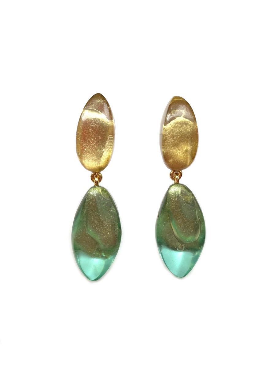 Juhlavat kullanhohtoiset korvakorut Dominique Denaiven mallistosta. Koruissa yhdistyy läpikuultava ja marmoroitu akvamariinin vihreä sekä kulta. Macy-korvakoruissa on siro lohkaremainen muoto ja korvakorumalli on yksi suunnittelijan suosituimmista.