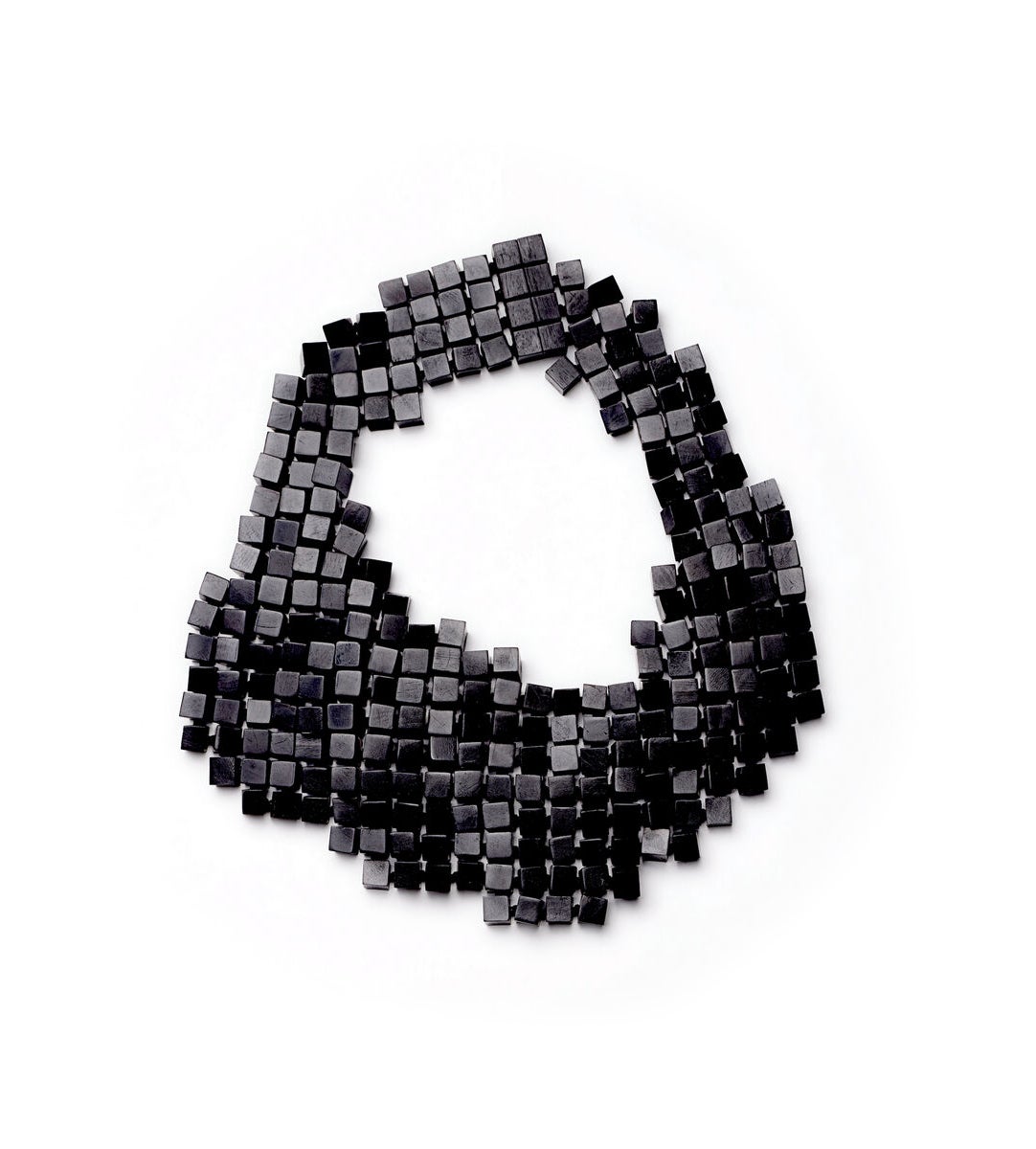 Veistoksellinen eebenpuu kaulakoru Monies'n ateljeesta. Koru on rakennettu kymmenistä pienistä neliönmuotoisista puuhelmistä. Näyttävän kokoinen kaulakoru on muotoiltu laskeutumaan kauniisti kaulalle, ja siinä on magneettilukko joka sulautuu korun muotoiluun.