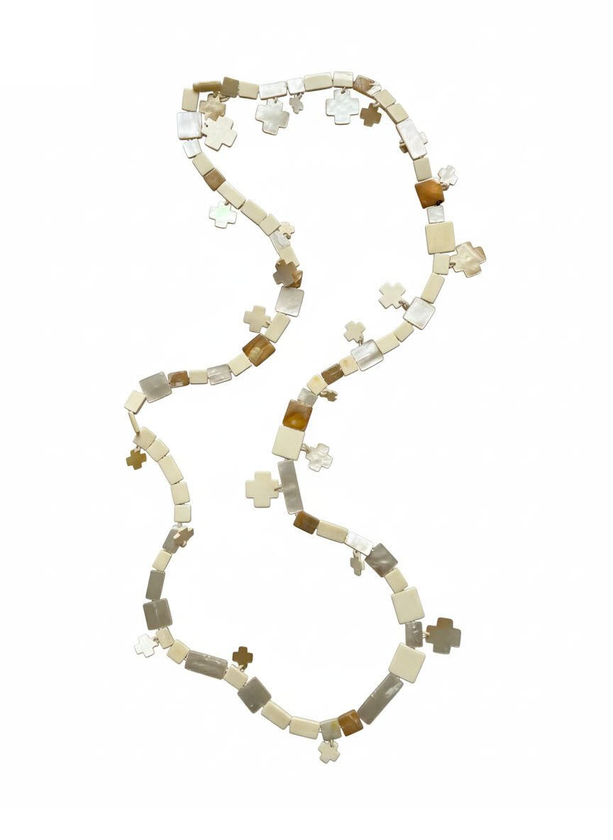 Vaaleat pitkät helmet Monies'n ateljeesta. Koru koostuu kulmikkaista ja ristinmuotoisista litteistä helmistä jotka on hiottu simpukoista ja luusta. Kaulakorun pääväri on luonnonvalkoinen, ja sen helmissä voi havaita myös hohtavaa helmiäistä, sekä beigen, ruskean ja keltaisen sävyjä. Juhlavat erikoispitkät helmet kuvastavat tanskalaismerkin ajatonta korusuunnittelua parhaimmillaan.